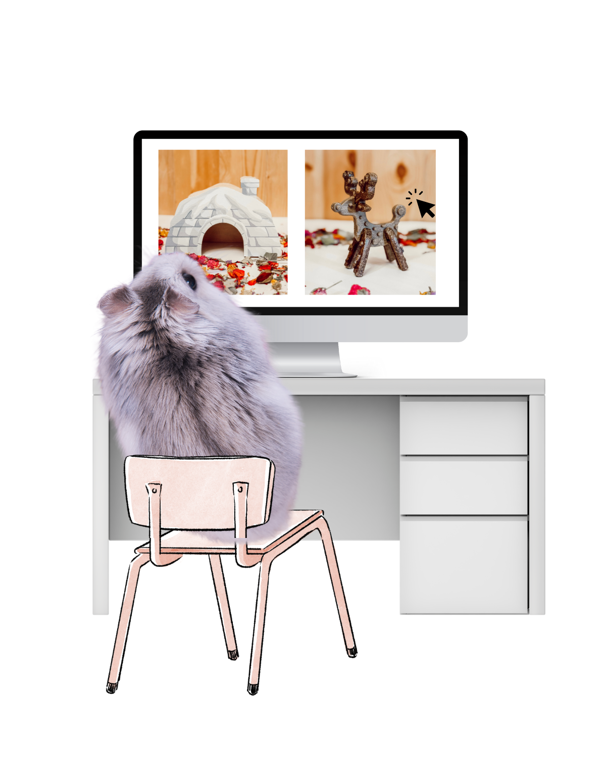 “A Large Wooden Hide, a Large Bundle of Sprays/Substrate, a Unique & Healthy Jar of Treats, a Hamster-Themed Human Item, a Puzzle Toy/Boredom Breaker, a Fancy Special Treat, and an item we’ll keep a Surprise!”
